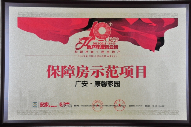 2013年1月18日,從全國(guó)工商聯(lián)房地產(chǎn)商會(huì)主辦的中國(guó)房地產(chǎn)業(yè)“2012-2013地產(chǎn)年度風(fēng)云榜”頒獎(jiǎng)盛會(huì)上傳來(lái)喜訊,北京廣安置業(yè)投資公司及廣安·康馨家園項(xiàng)目雙雙入選“2012-2013(第十屆)地產(chǎn)年度風(fēng)云榜”,置業(yè)公司喜獲2012-2013“民生地產(chǎn)功勛企業(yè)”、廣安·康馨家園項(xiàng)目獲得2012-2013“保障房示范項(xiàng)目”榮譽(yù)稱(chēng)號(hào),這是置業(yè)公司在2012年度所獲得的又一大獎(jiǎng),也是對(duì)公司及全體員工一年來(lái)的辛勤工作的肯定和鼓舞。此次盛會(huì)已經(jīng)引起了國(guó)內(nèi)房地產(chǎn)行業(yè)眾多公司及知名行業(yè)人士的關(guān)注和參與,全國(guó)300多家媒體對(duì)此次盛會(huì)進(jìn)行了跟蹤報(bào)道。