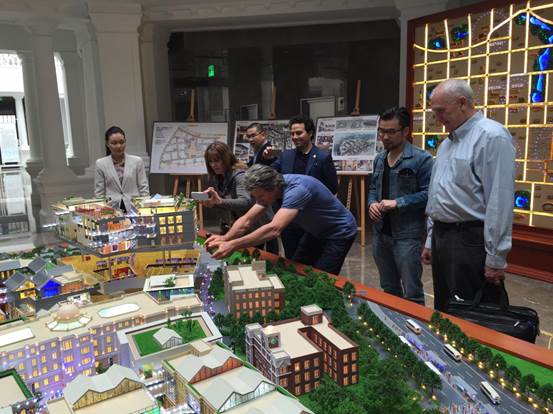 廣安置業(yè)營(yíng)銷總監(jiān)沈紅梅一行向來(lái)訪人員介紹了項(xiàng)目的定位與特點(diǎn),項(xiàng)目理念、設(shè)計(jì)細(xì)節(jié)以及富有民國(guó)特色的建筑風(fēng)格,得到了好萊塢電影大師的一致好評(píng),紛紛饒有興趣的詢問(wèn)相關(guān)信息、拍照留用。Jonathan Bollier表示北京坊項(xiàng)目令人驚艷,Phil Lengyel甚至開(kāi)玩笑的表示希望能在北京坊擁有一間自己的辦公室。