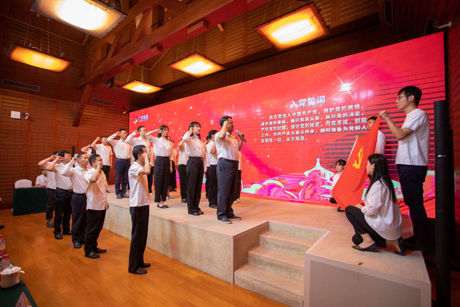 在集團(tuán)黨委書(shū)記、董事長(zhǎng)易勇同志的帶領(lǐng)下,預(yù)備黨員面向黨旗鄭重宣誓,18名老黨員代表上臺(tái),與臺(tái)下黨員同志們共同重溫入黨誓詞。宣誓后,預(yù)備黨員賈菲、宮禹暄、司瑀和姚軍林向大會(huì)鄭重表態(tài),在今后的工作和學(xué)習(xí)中,自覺(jué)用共產(chǎn)黨員的標(biāo)準(zhǔn)嚴(yán)格要求自己,更加勤奮盡責(zé),無(wú)愧于共產(chǎn)黨員光榮稱(chēng)號(hào)。