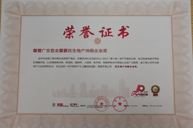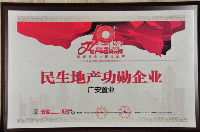 2013年1月18日,從全國(guó)工商聯(lián)房地產(chǎn)商會(huì)主辦的中國(guó)房地產(chǎn)業(yè)“2012-2013地產(chǎn)年度風(fēng)云榜”頒獎(jiǎng)盛會(huì)上傳來(lái)喜訊,北京廣安置業(yè)投資公司及廣安·康馨家園項(xiàng)目雙雙入選“2012-2013(第十屆)地產(chǎn)年度風(fēng)云榜”,置業(yè)公司喜獲2012-2013“民生地產(chǎn)功勛企業(yè)”、廣安·康馨家園項(xiàng)目獲得2012-2013“保障房示范項(xiàng)目”榮譽(yù)稱(chēng)號(hào),這是置業(yè)公司在2012年度所獲得的又一大獎(jiǎng),也是對(duì)公司及全體員工一年來(lái)的辛勤工作的肯定和鼓舞。此次盛會(huì)已經(jīng)引起了國(guó)內(nèi)房地產(chǎn)行業(yè)眾多公司及知名行業(yè)人士的關(guān)注和參與,全國(guó)300多家媒體對(duì)此次盛會(huì)進(jìn)行了跟蹤報(bào)道。